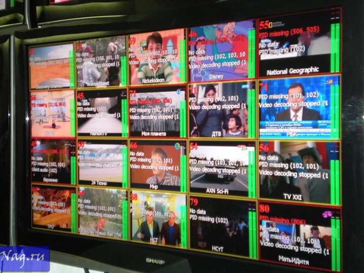 Если присмотреться к большим экранам, то можно отметить, что они разделены на небольшие "квадратики" - это видеоканалы, а надписи: тестовая информация о прошлых проблемах или сигналы настройки. Зеленые линии сбоку - звук в настоящий момент. Если рамки вокруг канала нет - все в порядке. Желтая рамка - проблема решена. Красная - проблема наблюдается в настоящий момент.