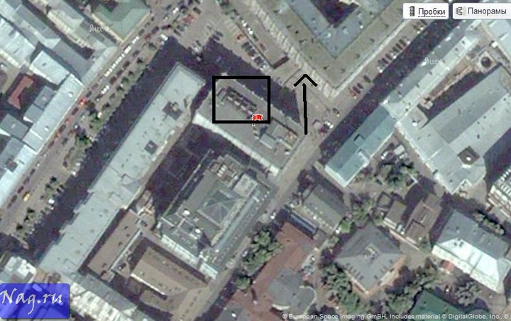 Фотографии антенного поля в Никитском переулке нет - только на спутниковом снимке видны 4 площадки для антенн, а стрелочкой указано местоположение Центра видеоуслуг.