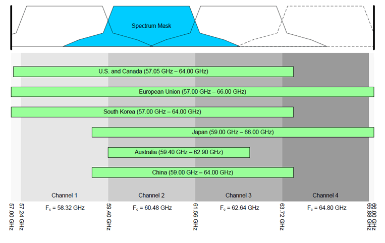 802.11ad – это очередная версия Wi-Fi, работающая в диапазоне 60 ГГц. Картина распределения спектра в диапазоне 2.4 и 5 ГГц давно знакома многим пользователям, но выделенный частотный план для 60-гигагерцового диапазона может показаться кому-то новым и удивительным. На рисунке 1 показано распределение спектра, выделенного для работы этого стандарта в разных странах.