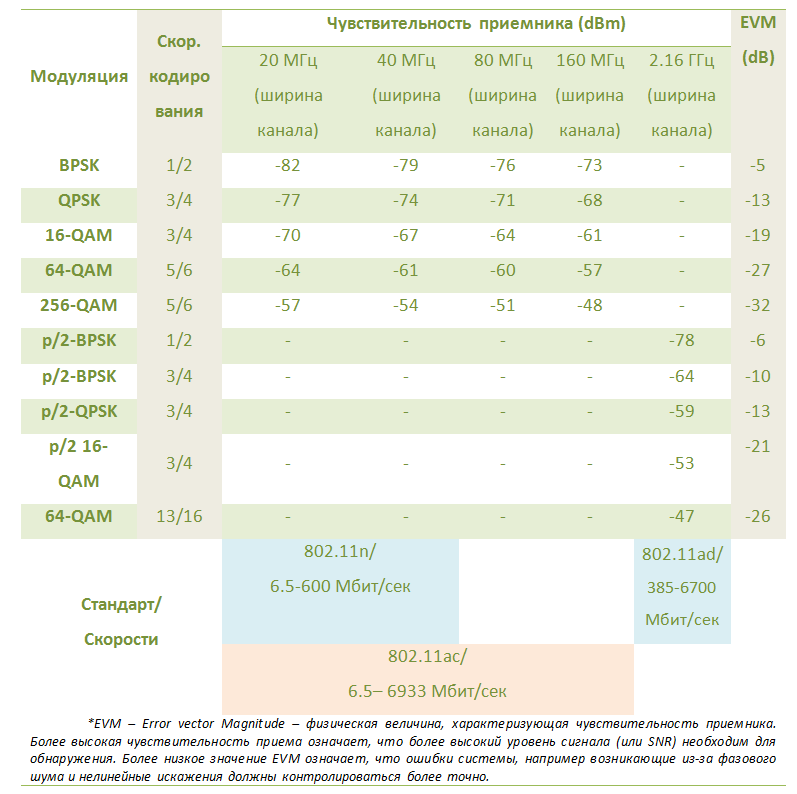 В таблице 1 приведены схемы модуляции и кодирования (Modulation and Coding Schemes - MCS), используемые в стандартах 802.11n/ac/ad для достижения мультимегабитных и мультигигабитных скоростей. Данные в таблице позволяют сравнить скорости передачи разных стандартов методы модуляции и кодирования, благодаря которым происходит достижение этих скоростей. Обратим внимание на то, что в 11n и 11ac используется длинный защитный интервал в 800 нс между передачей двух символов, возможна даже работа с коротким защитным интервалом в 400 нс. В то время как защитный интервал в 802.11ad составляет всего 48,4 нс.