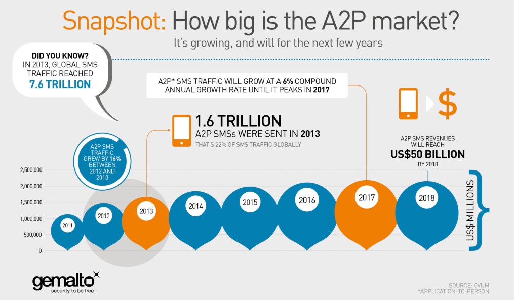 Этот рынок назвали A2P - Applications-to-Person. Из-Приложения-Пользователю. Это всевозможные идентификации и подтверждения в сторонних телекоммуникационных приложениях, например, подтверждение банковских трансакций и/или элемент двухфакторной авторизации.