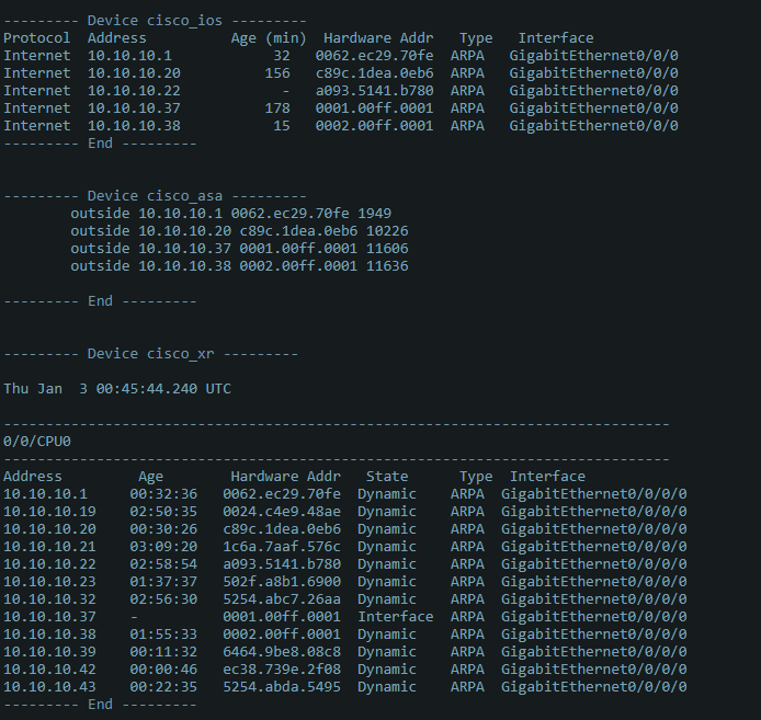 ...: output = net_connect.send_command("show arp")