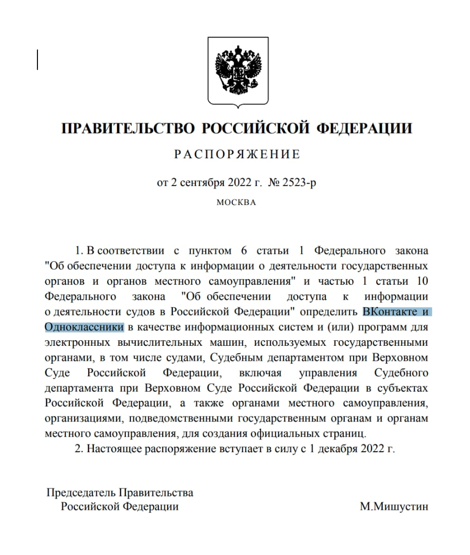 Минцифры РФ разработало проект распоряжения правительства, предусматривающий обязательное создание аккаунтов органов власти и судов в соцсетях «ВКонтакте» и «Одноклассники», сообщает Интерфакс.